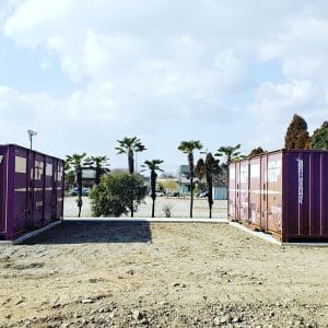 山口県宇部市・・ワンウェイ品20fハイキューブコンテナに中柱のある左右2枚のシャッター取り付け後、納品させて頂きました。とにかくおしゃれなお庭でした!完成が楽しみです(^^)