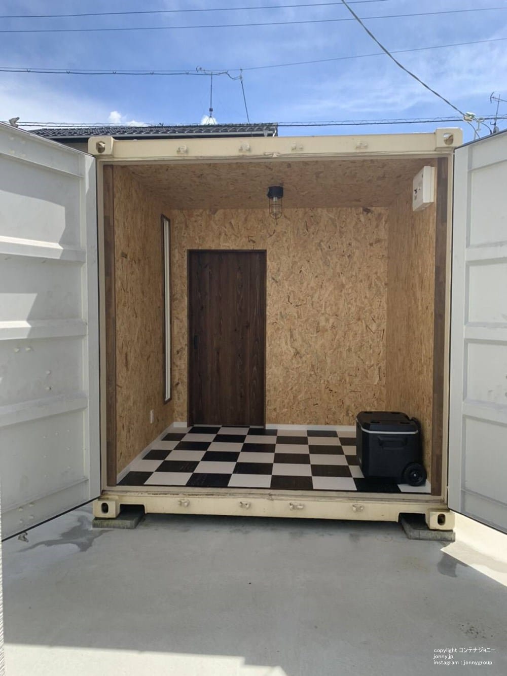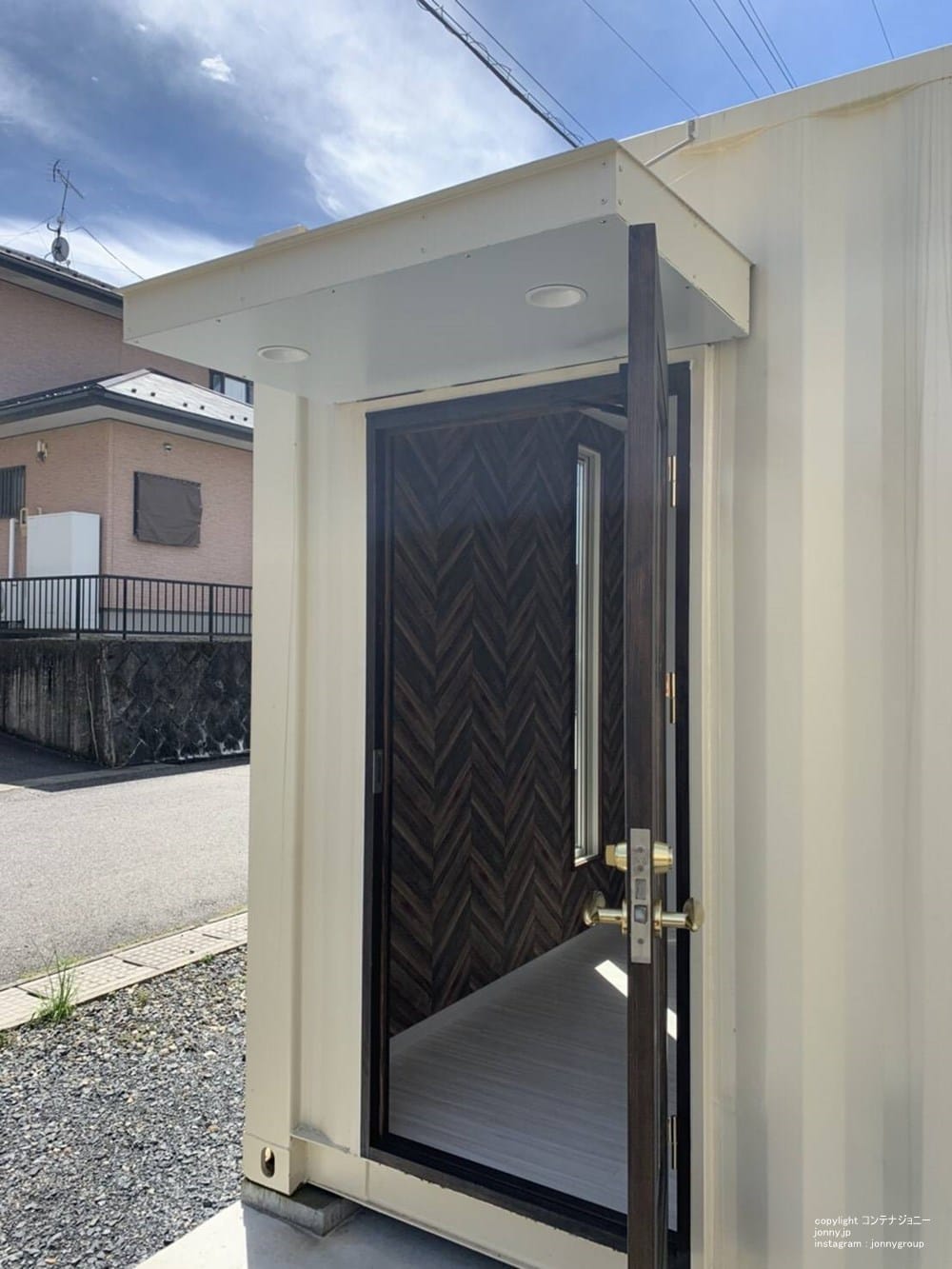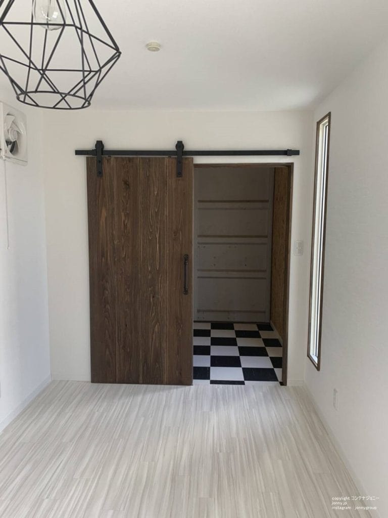 おしゃれで機能的な空間を、コンテナで実現します。オーダー製木枠店舗ドアを採用、店舗としてのネイルサロンスペースと物置スペースを兼ね備えています。