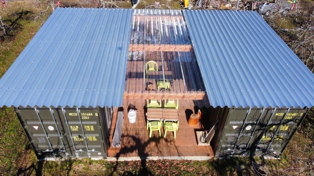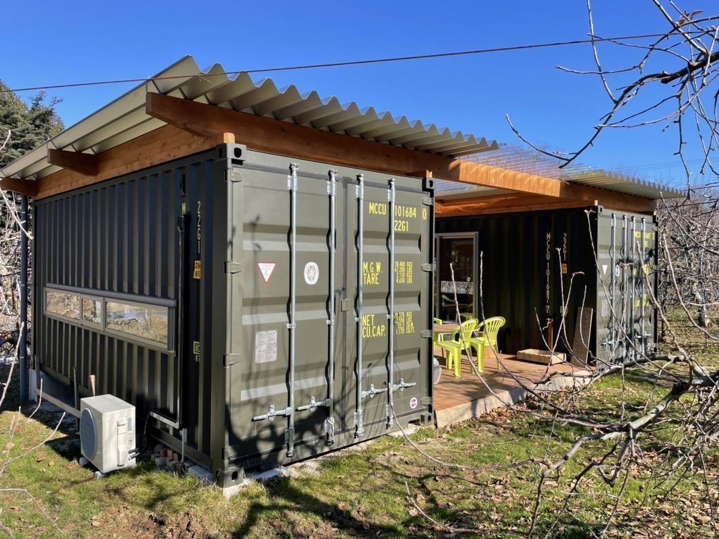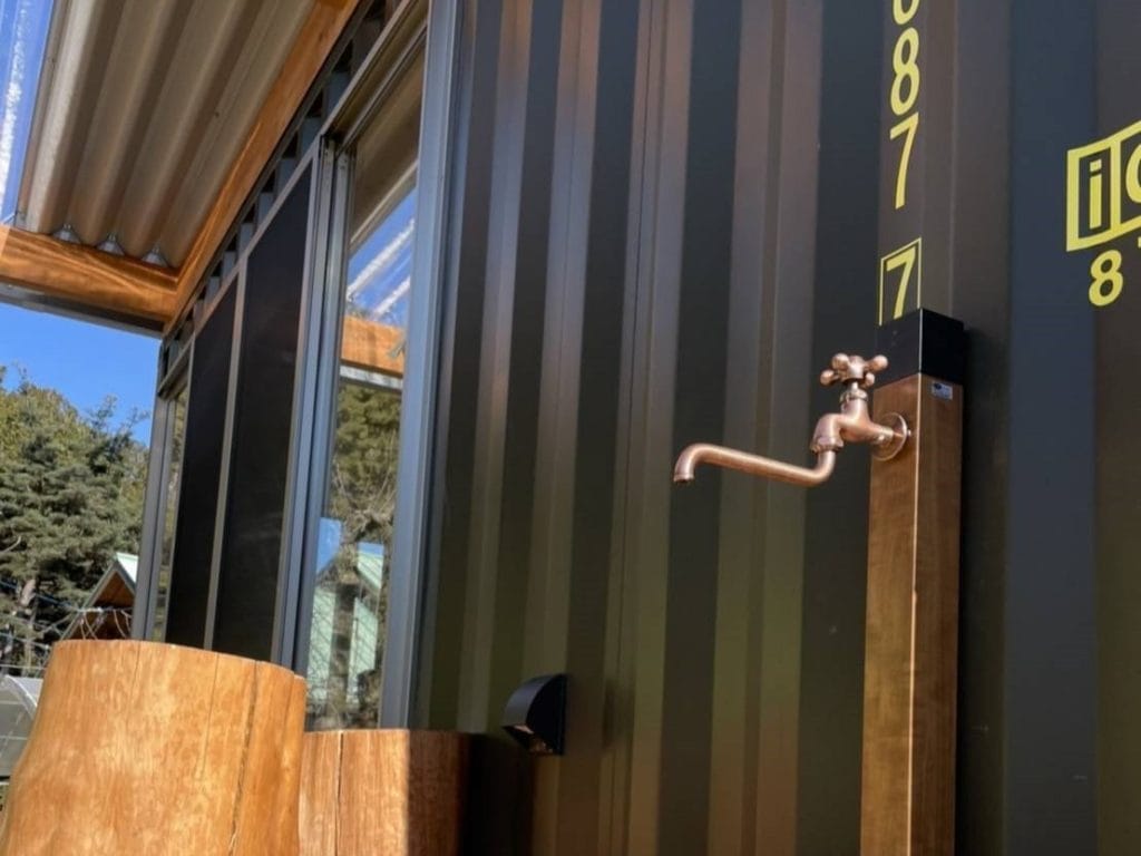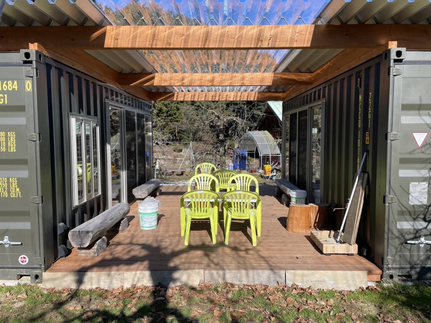 コンテナ内装は総ヒノキ仕上げとこだわりが詰まったコンテナを2台設置。向かい合わせで設置したコンテナと折板屋根、ウッドデッキ施工で雨の日も安心してくつろいでいただけます。